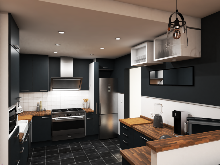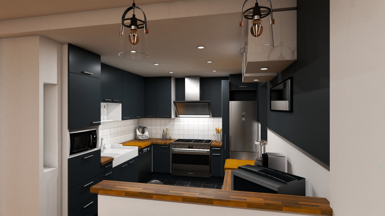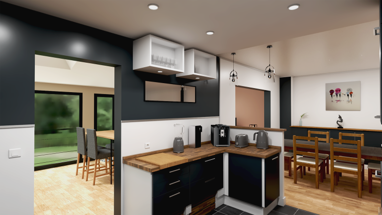 - Créer une cuisine fonctionnelle et conviviale intégrée à l’espace de vie principal, afin de renforcer la fluidité entre les zones repas et détente.