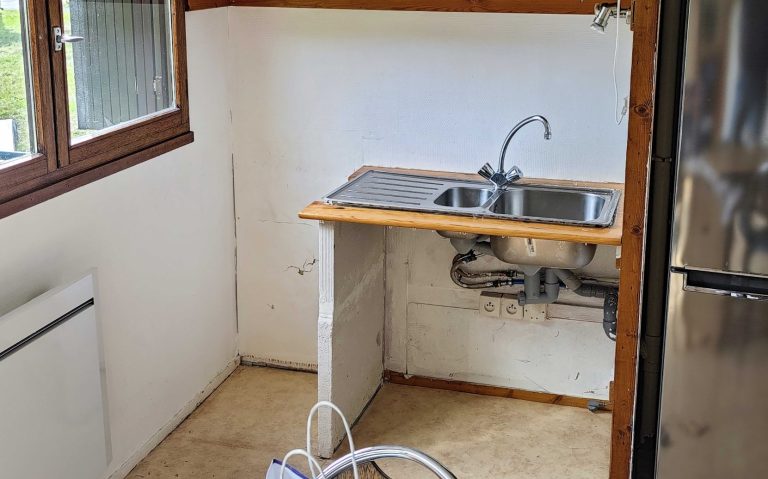 - Évier encastré inox → remplacé par un évier timbre d’office en céramique blanche ;