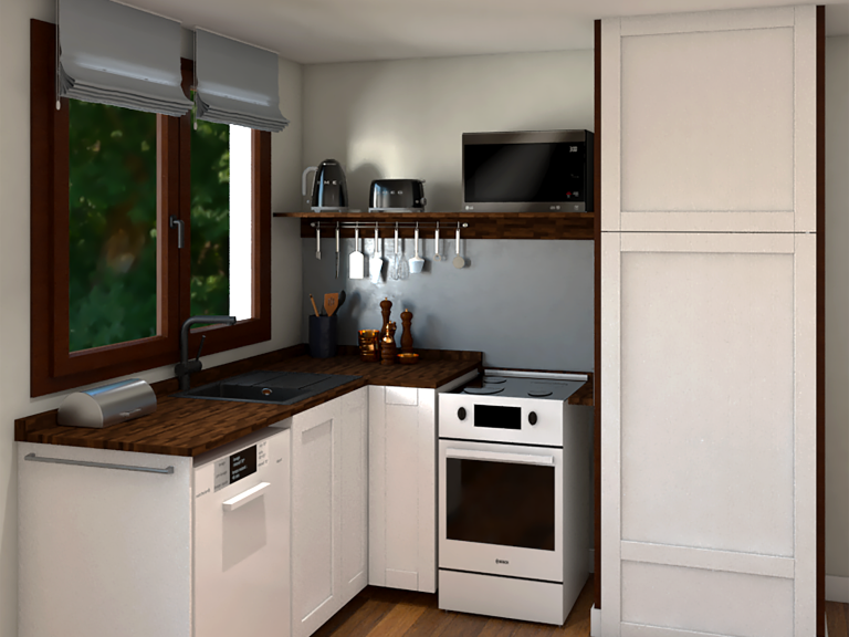 - Un meuble d’angle sur mesure, offrant un volume de rangement supplémentaire ;