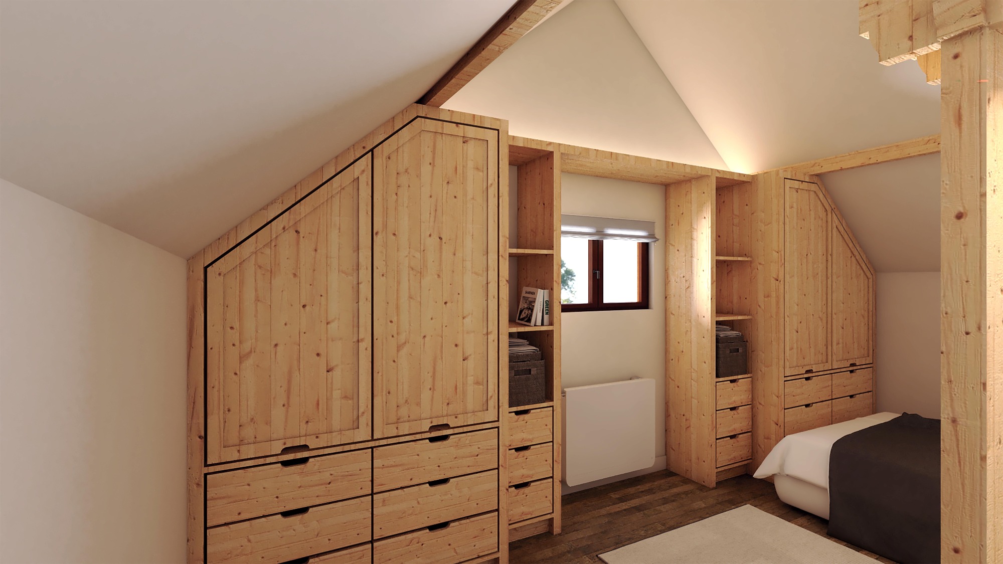 Pour cette troisième et ultime étape de la rénovation de cet appartement de montagne de 42 m², l’enjeu principal consistait à optimiser l’apport de lumière naturelle dans la chambre nichée sous les combles.