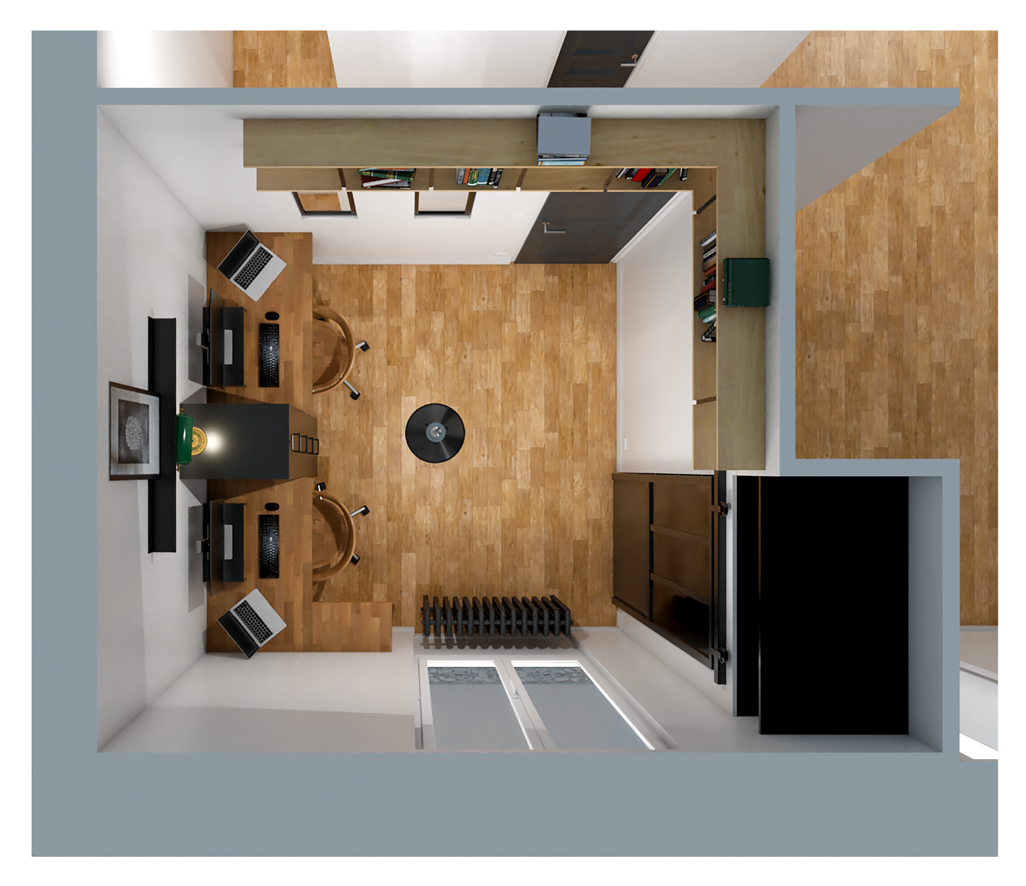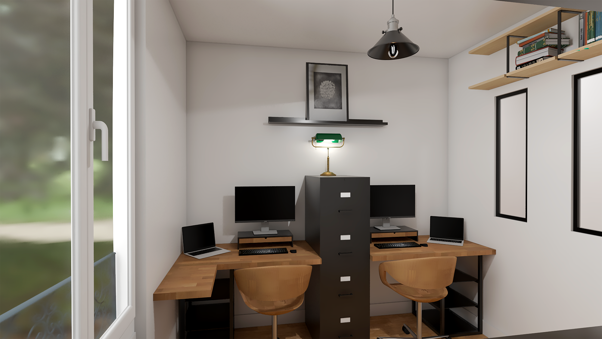 Anciennement chambre d’enfant (9 m²), cette pièce a été entièrement repensée pour devenir un bureau fonctionnel répondant aux besoins d’un double poste de travail, dans un esprit industriel.