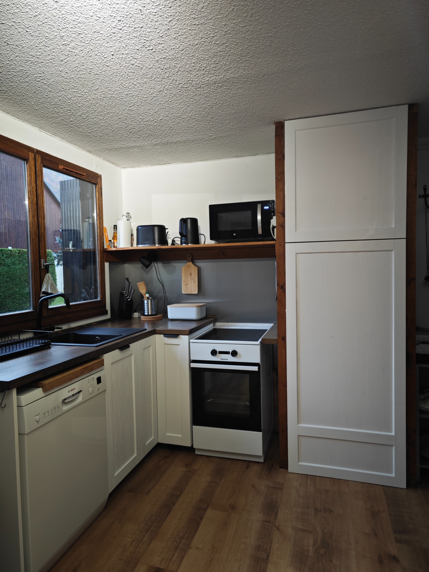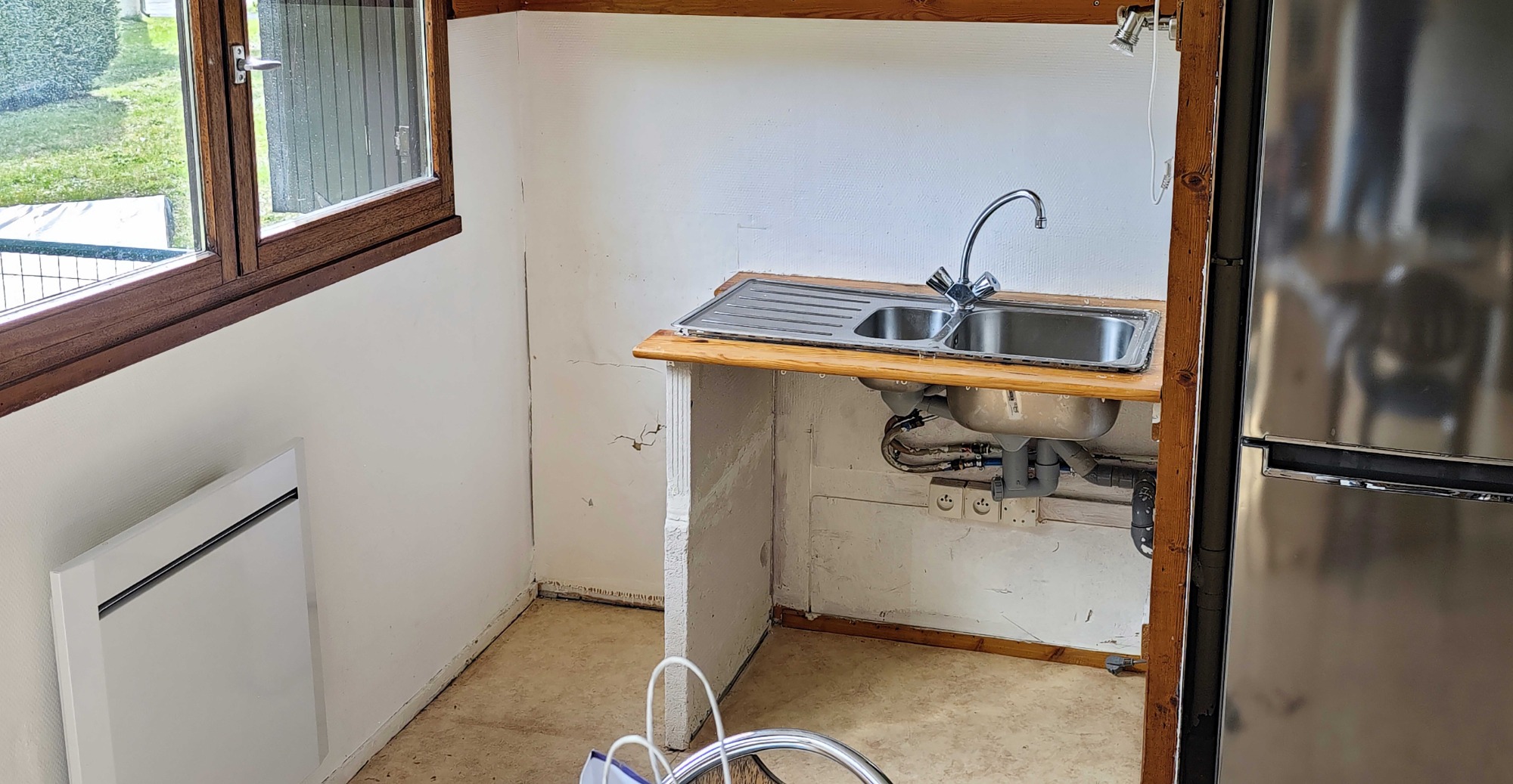 - Évier encastré inox → remplacé par un évier timbre d’office en céramique blanche ;